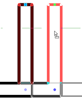 Uwaga: W przypadku edycji profilu elewacji ściany, której środkowa płaszczyzna skrajna jest połączona z inną ścianą, linia pionowa reprezentująca środkową płaszczyznę skrajną jest wyrównana z osią połączonej ściany, a nie z rzeczywistą powierzchnią ściany. Po anulowaniu trybu edycji połączenie zostaje wyczyszczone a linia pionowa przesuwa się tak, aby pokryć się z powierzchnią połączonej ściany.