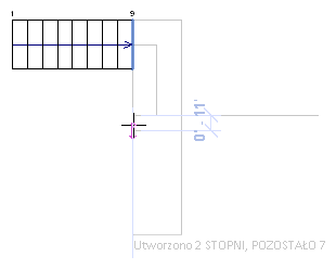 - Przesuń kursor wzdłuż linii pomocniczej i kliknij, aby rozpocząć rysowanie pozostałych podstopnic dla drugiego biegu. Zwróć uwagę, że spocznik jest tworzony automatycznie. (Domyślna głębokość spocznika jest taka sama jak szerokość biegu).