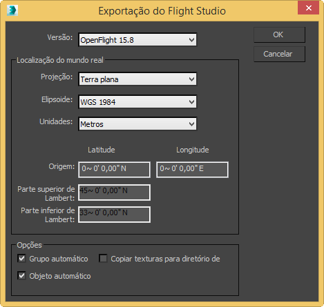 - Se o arquivo OpenFlight for exportado para um diretório diferente, quando esta opção for ativada, as texturas serão copiadas para o mesmo diretório de destino. Quando desativada, as texturas não são copiadas. Padrão=ativado.