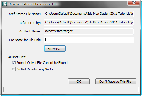 - Quando o 3ds Max não puder localizar o arquivo vinculado, use este campo para inserir outro caminho e nome de arquivo. O 3ds Max verifica se o arquivo já existe naquela localização e indica seu status no canto inferior esquerdo da caixa de diálogo.