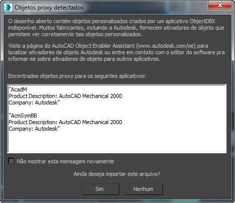 Ao usar o File Link Manager para anexar um arquivo DWG à sua cena, você poderá encontrar uma caixa de diálogo Objetos proxy detectados. Isto significa que há objetos personalizados no desenho que requerem ativadores de objeto especiais antes de editar os objetos no 3ds Max.