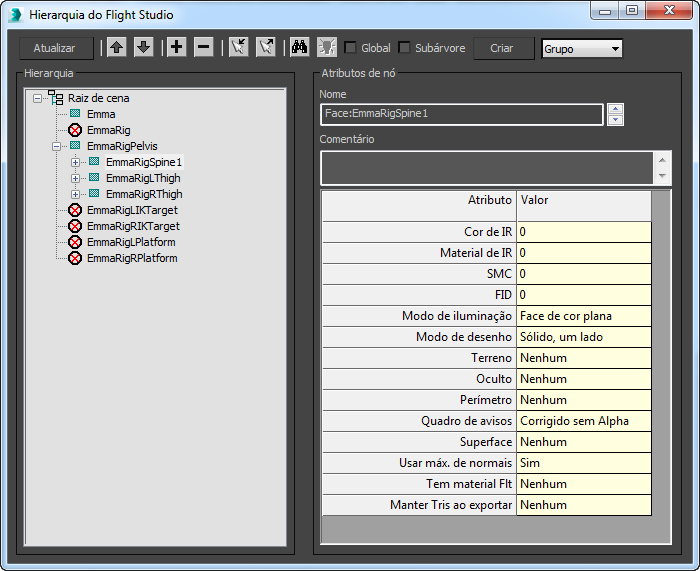 A lista Hierarquia exibe toda a estrutura do nó, conforme ele foi importado do arquivo OpenFlight.