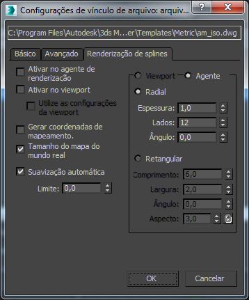 O painel Renderização de splines das Configurações de vínculo de arquivo: a caixa de diálogo Arquivos DWG controla como as formas aparecerão na cena assim que o arquivo DWG ou DXF for vinculado. É possível controlar a aparência da forma, sua suavização, as coordenadas de mapeamento e se elas podem ser renderizadas.