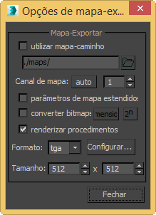 A caixa de diálogo Exportação de mapa fornece configurações para exportar mapas como parte das definições de material, juntamente com arquivos OBJ exportados.
