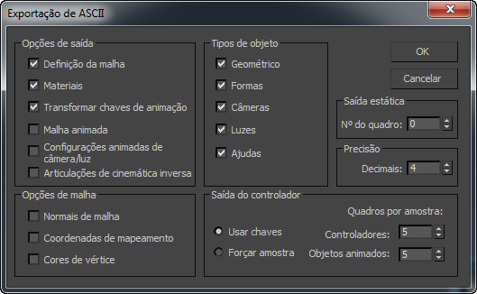 - Usar chaves Exporta valores de chave. Se o controlador não utilizar chaves, então o método de Forçar amostra será utilizado. No caso dos controladores de transformação, a opção Usar chaves somente funcionará se todos os controladores de transformação forem Lineares/TCB ou Bezier. Se uma das trilhas de transformação utilizar um tipo diferente de controlador, então o método de Forçar amostra será utilizado para todas as trilhas de transformação.