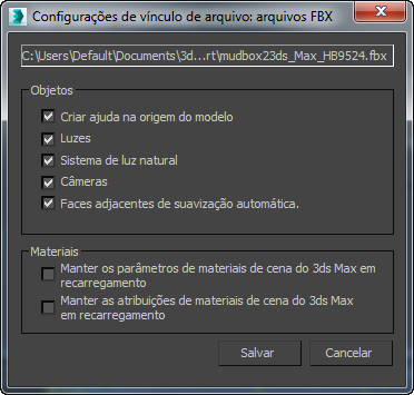 Configurações de Vínculo de arquivo para arquivos FBX do Autodesk genéricos (sem lista Combinar Entidades)