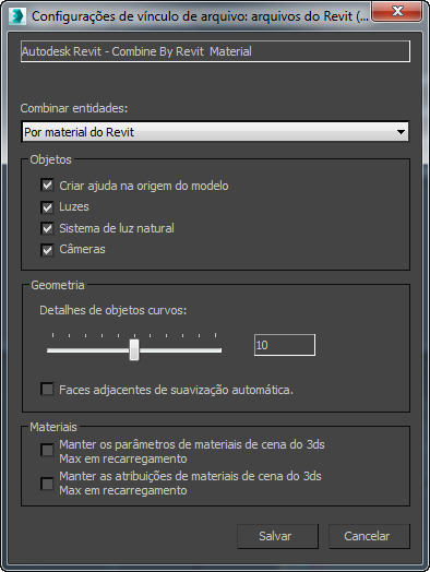 A caixa de diálogo oferece controle sobre alguns detalhes de como a geometria é convertida dos arquivos Revit e FBX e interpretada no 3ds Max. Em particular, ela oferece diversas formas para combinar a geometria e reduzir a complexidade da cena do 3ds Max, o que pode melhorar o desempenho.
