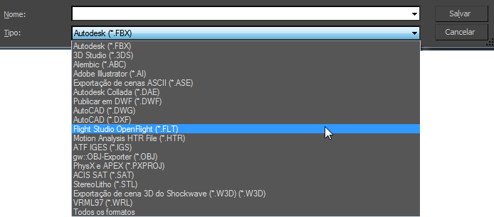- Na caixa de diálogo Exportar, use o menu suspenso Tipo de arquivos para alterar o tipo de arquivo para OpenFlight (*.flt).