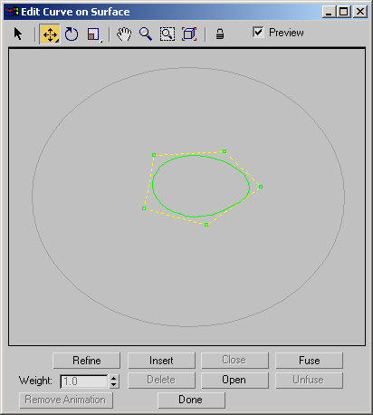 Essa caixa de diálogo permite editar as curvas em superfícies à medida que você edita curvas regulares em um viewport. A peça principal da caixa de diálogo há uma vista bidimensional da superfície. Os controles fornecem funções de edição típicas de curva.
