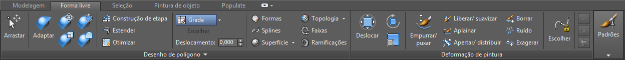 A guia Forma livre contém ferramentas para a criação e modificação de geometria do polígono por meio de"pintura" nas viewports. Além disso, o painel Padrões disponibiliza a gravação e o carregamento das configurações de pincel.
