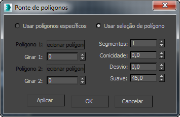 Clique em cada botão de seleção sucessivamente e, em seguida, clique em um polígono ou uma aresta de borda em uma viewport. No nível de subobjeto Borda, clicar em qualquer borda em uma borda designa toda a borda para ligação em ponte. Além disso, as arestas que você seleciona em cada borda estão conectadas diretamente, e as arestas restantes estão conectadas em ordem consecutiva. É possível alterar a ordem das correspondências de bordas com as configurações de Giro. Disponível somente no modo Usar específicos.