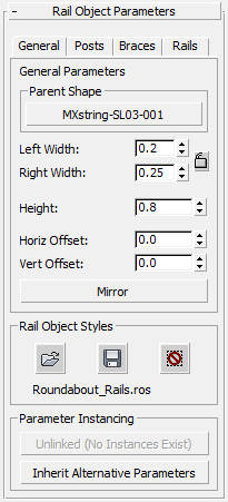 - Exibe o objeto de forma pai ao qual o estilo de objeto de cerca está aplicado atualmente. Para alterar a forma principal, clique neste botão e, em seguida, selecione um novo objeto de forma principal em um viewport.
