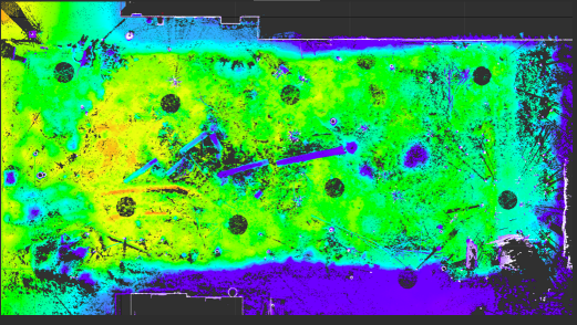 Vista superior de uma nuvem de pontos de um terreno com uma rampa de elevação mostrando as alturas relativas de diferentes áreas