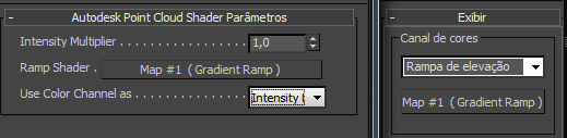 - Também na implementação Parâmetros do sombreador de nuvem de pontos, configure o parâmetro Usar canal de cores como (lista suspensa) para a opção ativa na implementação Exibição do painel de comandos. Por exemplo, Rampa de intensidade.