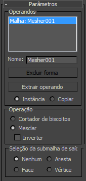 Proporciona opções que permitem especificar qual nível de seleção é passado para cima na pilha. O objeto ShapeMerge armazena todos os níveis de seleção; ou seja, ele armazena os vértices, as faces e as arestas da forma mesclada com o objeto. (Ao aplicar um modificador de seleção de malha e ir para os diferentes níveis de subobjeto, será possível ver que a forma mesclada estará selecionada). Portanto, ao seguir o ShapeMerge com um modificador que atue sobre um nível específico, como Extrusão de face, por exemplo, esse modificador irá funcionar corretamente.
