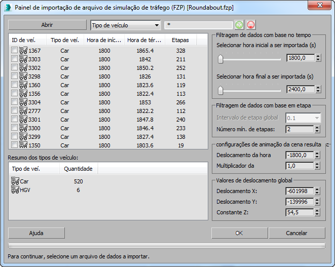 Estes controles permitem ajustar o intervalo de etapas da animação para melhorar a leitura do arquivo e reduzir o número de chaves de animação geradas para cada veículo importado.
