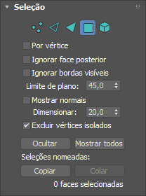 Quando ativado, a seleção de subobjetos seleciona somente os subobjetos cujas normais são visíveis na viewport. Quando desativado (o padrão), a seleção inclui todos os subobjetos, independentemente da direção de suas normais.