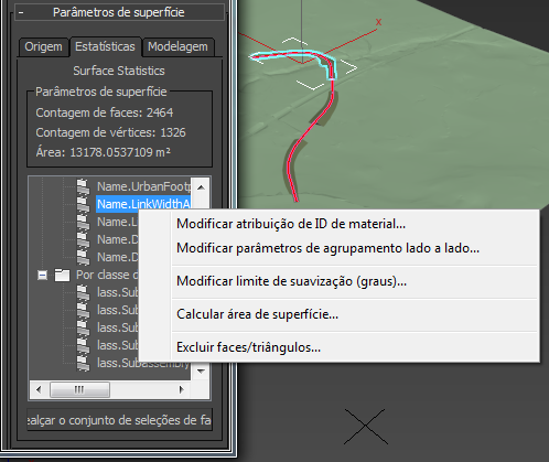 Para Superficies de corredor importadas do AutoCAD Civil 3D, uma ampla gama conjuntos de seleção de triângulo/face é exibida, a qual se relaciona diretamente para a estrutura do corredor original. Isso permite identificar as faces individuais através da geração de um código de vínculo, nome de submontagem e classe de submontagem.