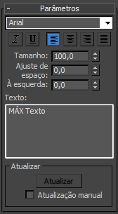 O texto pode usar qualquer fonte do Windows instalada no seu sistema, ou uma fonte PostScript Tipo 1 instalada na pasta \Fonts , contida na pasta de instalação raiz do 3ds Max.