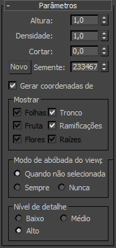 Controla a exibição de folhas, frutas, flores, tronco, galhos e raízes de plantas. As opções disponíveis dependem do tipo de planta selecionada. Por exemplo, se uma planta não tiver frutas, o 3ds Max desativará essa opção. Desativar as opções reduz o número de vértices e faces exibidos.