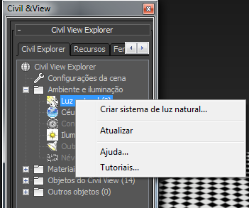 A forma mais fácil de adicionar um sistema de Luz natural na cena do Civil View é clicar com o botão direito do mouse no nó Luz natural no Civil View Explorer e selecionar Criar sistema de luz natural.