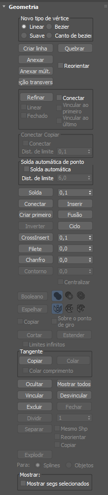 As funções disponíveis no nível de objeto de spline editável (isto é, quando nenhum nível de subobjeto estiver ativo) também estão disponíveis em todos os níveis de subobjeto e funcionam exatamente da mesma maneira em cada nível.