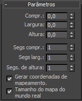 Define o comprimento, a largura e a altura do objeto Caixa. Esses campos também agem como leituras ao arrastar os lados da caixa. Padrão = 0,0,0.