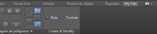 Quando você adiciona um comando à faixa de opções dessa maneira, ele cria um botão. O comportamento do botão depende da natureza do comando conforme definido no software. Por exemplo, o botão para um primitivo geométrico, como a Caixa permanecerá ativado quando clicado, de modo que você pode criar diversas caixas consecutivas. Em contrapartida, um botão para um modificador só é ativado momentaneamente, aplicando o modificador ao objeto selecionado.