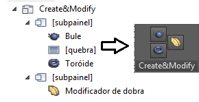 Agora o painel Criar e modificar fornece uma lista dos três itens: dois objetos e um modificador. Isso apresenta um problema de projeto, porque objetos e modificadores têm funcionalidade diferente. É melhor separá-los na interface, mesmo se eles estiverem no mesmo painel. Uma maneira de fazer isso é usando o controle de subpainel, o que permite criar seções paralelas em um painel.
