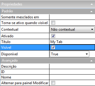 Você também pode adicionar guias e painéis personalizados cujo conteúdo seja mais adequado ao seu fluxo de trabalho. Cada elemento da faixa de opções, desde as guias até as ferramentas individuais, tem inúmeras propriedades que você pode definir, como nome, tamanho, status de ativado e outros. Também é possível definir que o status Visível e Ativado da maioria dos elementos da faixa de opções seja condicionado ao contexto ativo.