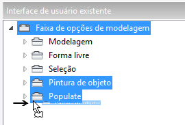 Quando você soltar o botão do mouse, o item aparecerá no local onde a seta estava apontando. Se nada acontecer, isso significará que você tentou colocar o comando em uma posição incompatível. Por exemplo, um separador deve ser colocado em um painel ou subpainel; ele não pode ser descendente direto de uma guia.
