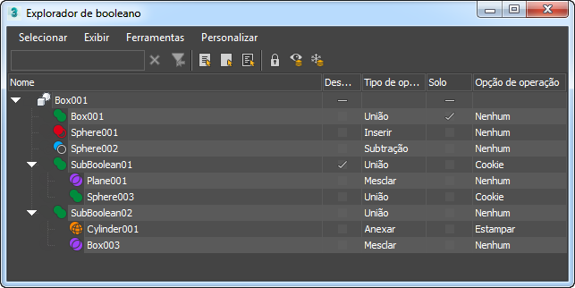 Os operandos aparecem automaticamente no Explorador de booleano sempre que você adicionar um operando na implementação de Parâmetros boolianos. Além disso, é possível arrastar objetos do Scene Explorer para o Explorador de booleano a fim de adicioná-los como novos operandos. Todas as alterações feitas na ordem dos operandos e das respectivas operações na implementação de Parâmetros Boolianos são automaticamente atualizadas no Explorador de booleano.