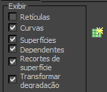 Quando ativada, exibe retículas de controle em linhas amarelas. (É possível alterar a cor da retícula usando o painel Cores da caixa de diálogo Personalizar interface do usuário.) Os níveis de subobjetos Curva de VC e Superfície de VC também têm uma alternância local para Exibir grade, que substitui a configuração global no nível de subobjeto. As configurações de Curva VC e Superfície de VC são independentes. Em outras palavras, no nível de subobjeto, é possível ativar a retícula das curvas de um objeto, mas não as respectivas superfícies ou vice-versa.
