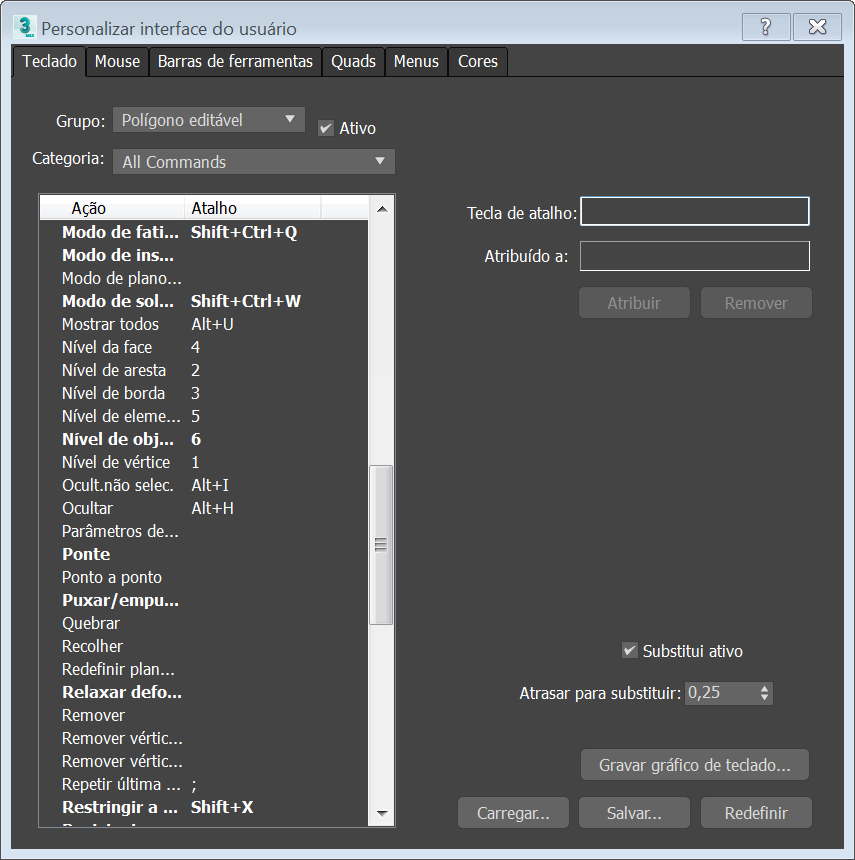 Utilizar uma única tecla de atalho ao alterar o nível de subobjeto é chamado de Seleção de subobjeto. Para visualizar/atribuir o atalho de teclado para esta ação, vá para Personalizar