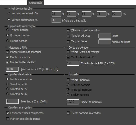 No painel Otimização, escolha a otimização níveis para gerar e as opções que estará ativo.