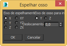 Abre a caixa de diálogo Espelhar osso (consulte a seguir), que permite criar cópias espelhadas dos ossos selecionados sem alterar o sinal da escala dos ossos. Em vez disso, a função Espelhar inverte um dos eixos da estrutura: Y ou Z. É possível especificar o eixo a ser espelhado e o eixo a ser invertido com os controles da caixa de diálogo.