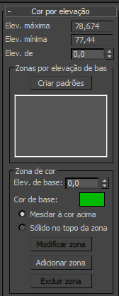 Os itens nesta caixa de grupo atribuem cores às zonas de elevação. Por exemplo, pode desejar alterar os níveis de azul para indicar a profundidade da água. Suas alterações na área Zona da cor não afeta o objeto terreno até você clicar no botão Modificar zona ou Adicionar zona.