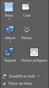 O painel Geometria (todas) fornece um subconjunto das ferramentas de modelagem da Implementação Editar geometria e adiciona Fechar polígono para criar um polígono de um vértice ou seleção de arestas e as ferramentas Quadrificar para conversão de polígonos para quadriláteros.