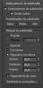 Especifica as configurações de aproximação de superfície para subdividir um objeto de polígono editável. Esses controles funcionam como as configurações de aproximação de superfície para as superfícies doNURBS. Eles são utilizados quando você aplica um Mapa de deslocamento para o objeto de polígono editável.