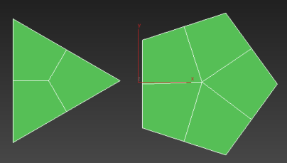 O OpenSubdiv funciona em polígonos quadriláteros. Se o modificador encontra um polígono que não é quadrilátero, ele o converte para vários quadrados. Isso é feito encontrando o ponto central do polígono, inserir um vértice e, em seguida, dividindo o polígono do centro para cada extremidade do ponto central. A ilustração a seguir mostra um triângulo e um pentágono que foram divididos em quadrados usando este método: