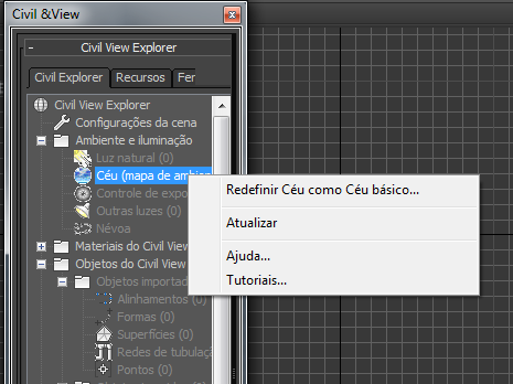 Também é possível redefinir o céu (ou alternar para Céu Físico mr com base no mental ray) ao clicar com o botão direito do mouse na entrada Céu ( Mapa de Ambiente) no painel superior do Civil View Explorer.
