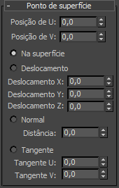 Se o ponto assentar na superfície, é possível movê-lo usando a transformação Mover. É possível também movê-lo usando o botão Mover ponto de superfície. Consulte Editar subobjetos de ponto. De qualquer forma, isto atualiza os valores da posição U e da posição V.