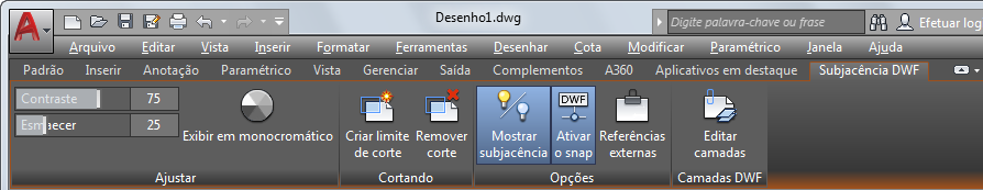 Altera as opções da exibição, corte, camada e osnap da subjacência DWF.