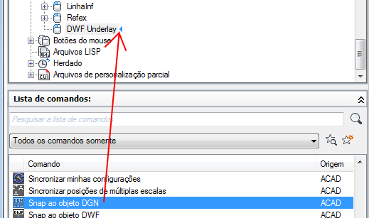 - Se você deseja substituir o comando atual atribuído a uma ação de clique duplo, arraste um comando do painel Lista de comandos para a ação de clique duplo no painel Personalizações em <nome do arquivo>.