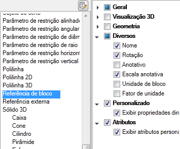Quando as categorias Personalizado e Atributos estiverem marcadas, as propriedades dinâmicas e os atributos de um bloco serão exibidos na paleta Propriedades rápidas.