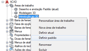 Os espaços de trabalho em um arquivo CUIx podem ser marcados como o padrão. Definir um espaço de trabalho como padrão determina que ela deve ser restaurada quando o arquivo CUIx for carregado no programa pela primeira vez, ou após carregar o arquivo CUIx com o comando CARREGARIUP.