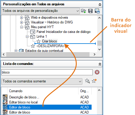 No painel Lista de comandos, na caixa de texto Pesquisar a lista de comandos, digite bloco. Selecione Criar bloco (comando BLOCO) e arraste-o para a Linha 1 abaixo de Meu painel HYT.