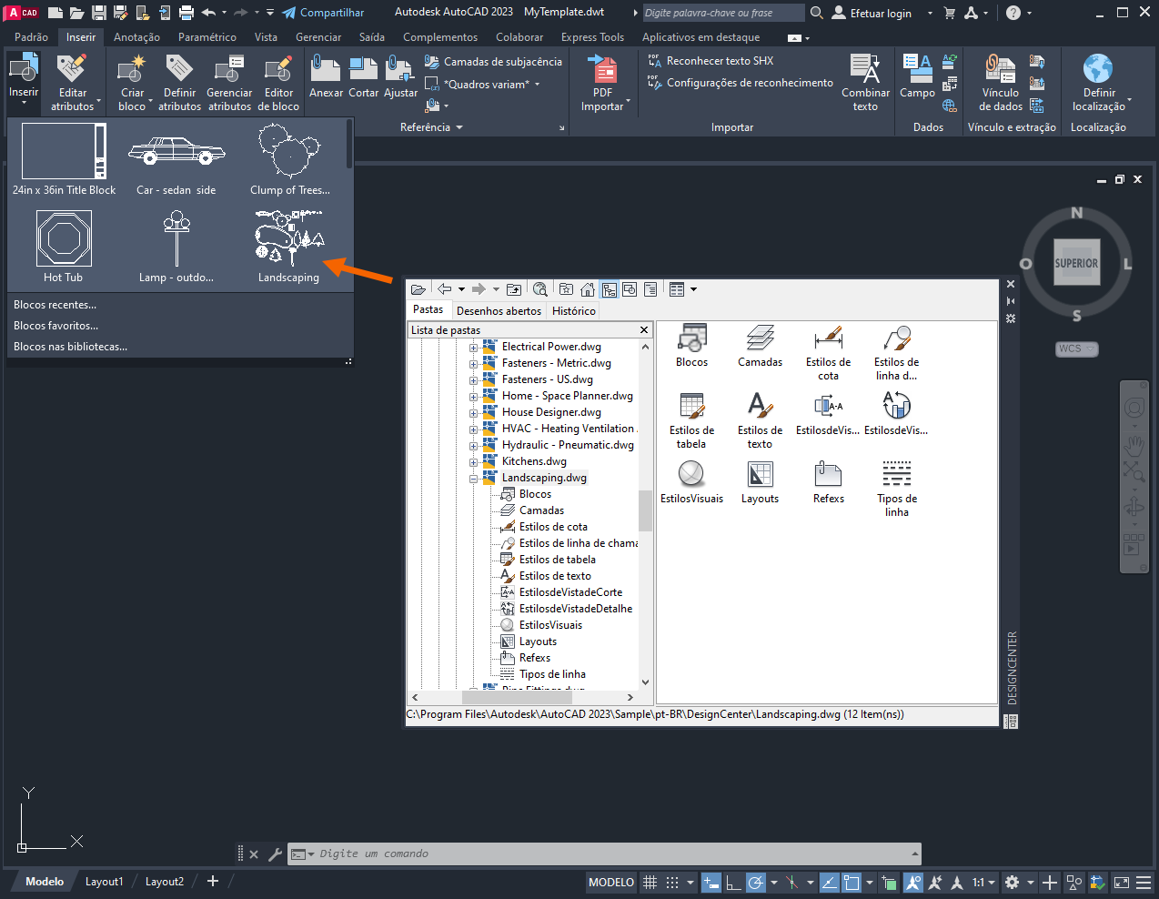 Adicione as camadas, os blocos e os estilos do Landscaping.dwg ao template.
