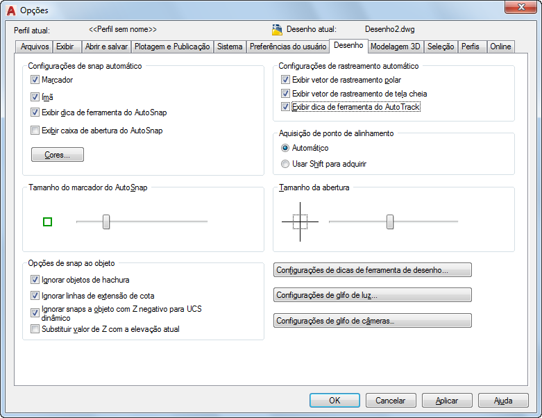 Define opções para vários recursos de edição, incluindo AutoSnap e AutoTrack.