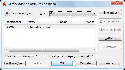 Os atributos do bloco selecionado são exibidos na lista de atributos. Por padrão, as propriedades de atributos Identificador, Prompt, Padrão, Modo e Anotativo, são exibidas na lista de atributos. Será fornecido para cada bloco selecionado uma descrição abaixo da lista de atributos que identifica o número de suas ocorrências no desenho e no layout atuais.